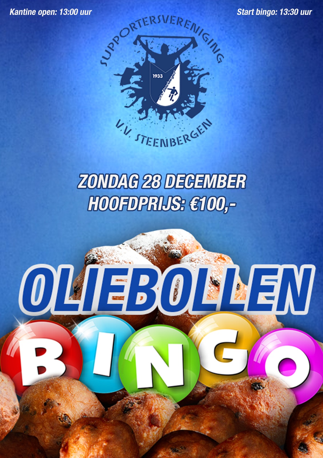 Wij nodigen u allen uit om gezellig met ons bingo te komen spelen en zoals u gewend bent zullen wij deze middag meerdere malen met (gratis) vers gebakken oliebollen rond gaan. Iedereen is welkom tijdens deze gezellige middag. De supportersvereniging ziet er naar uit jullie te verwelkomen!